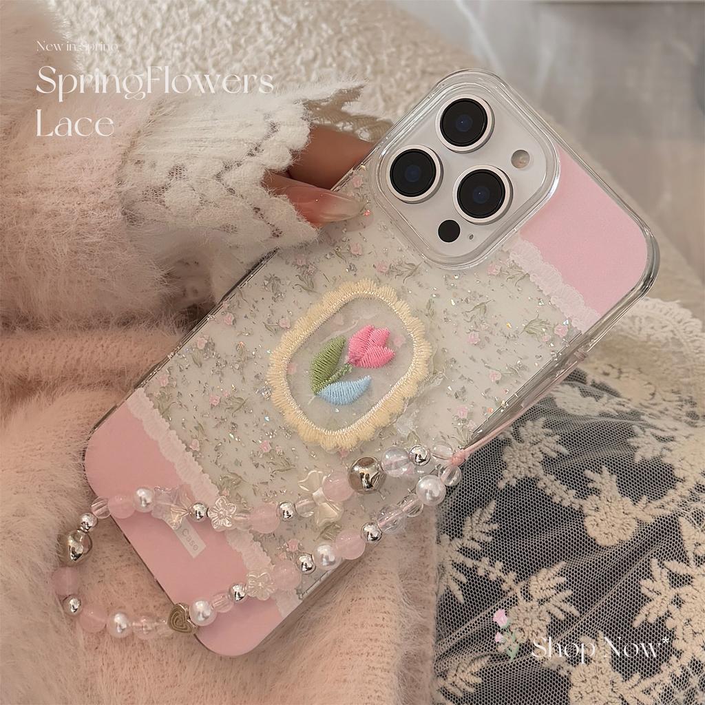 Pink Flower Embroidery Suitable for Apple 16promax Mobile Phone Case 17 Glitter Powder Iphone14 Art 11 Hanging Chain 13