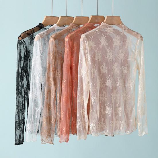This high-quality lace shirt for women is crafted from premium polyester, offering a lightweight, breathable, and natural feel. The solid color design features a stylish high neck collar and long sleeves, making it versatile for various occasions.