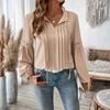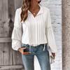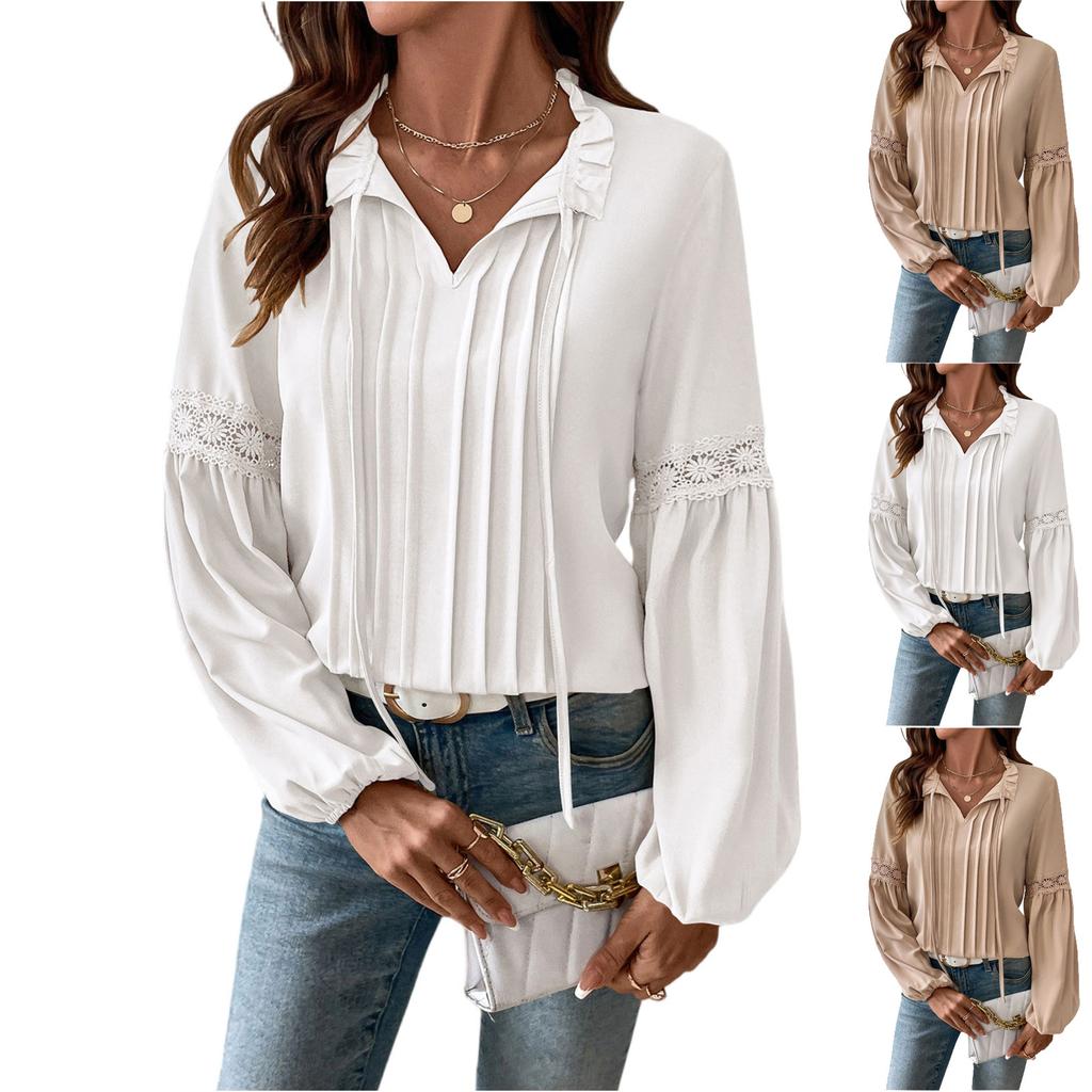 Women's Fashion Casual Lace V-Neck Solid Color Long Sleeve Pleated Shirt Women's T-Shirt Top