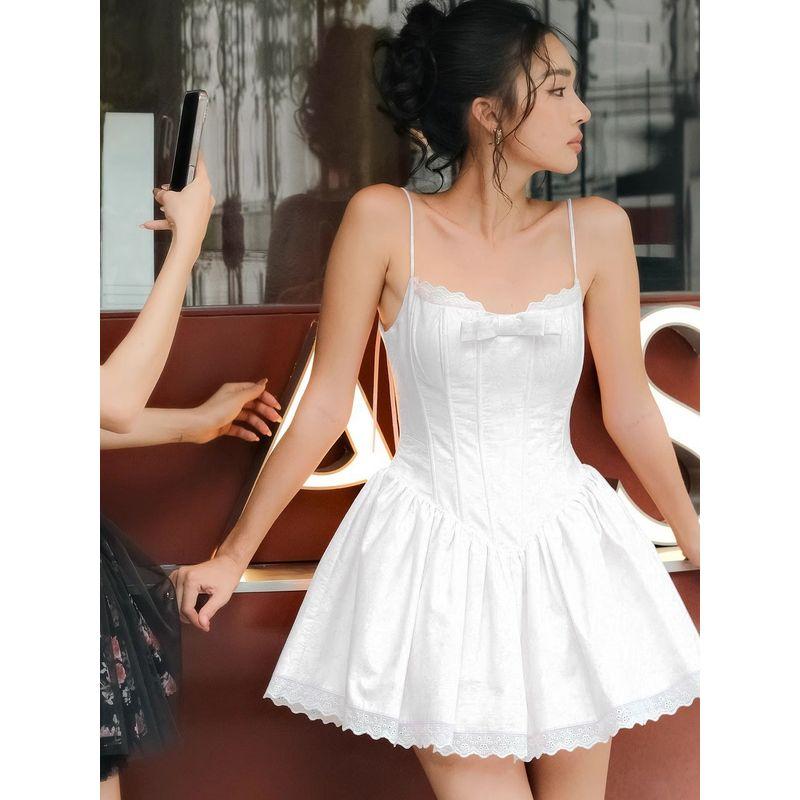 Girl Dingge Sweet Summer Vietnamese Niche Escaped Princess Sweet Bow Lace Edge Puffy Sling Dress