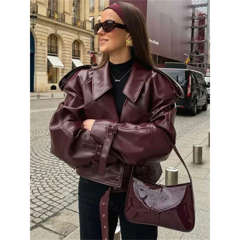 Ankela Red Fall and Winter Sexy Retro Short Leather Jacket