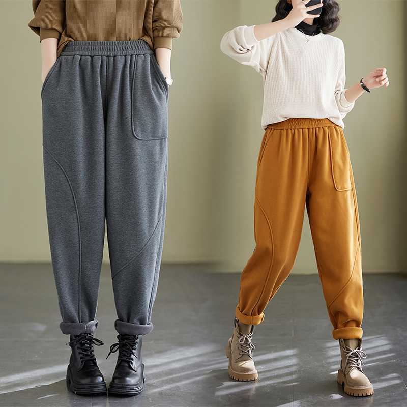 Women's Spring, Autumn Winter Thick Stitching Sweatpants, Casual Solid Color Elastic Waist, Outer Wear Trousers with Feet