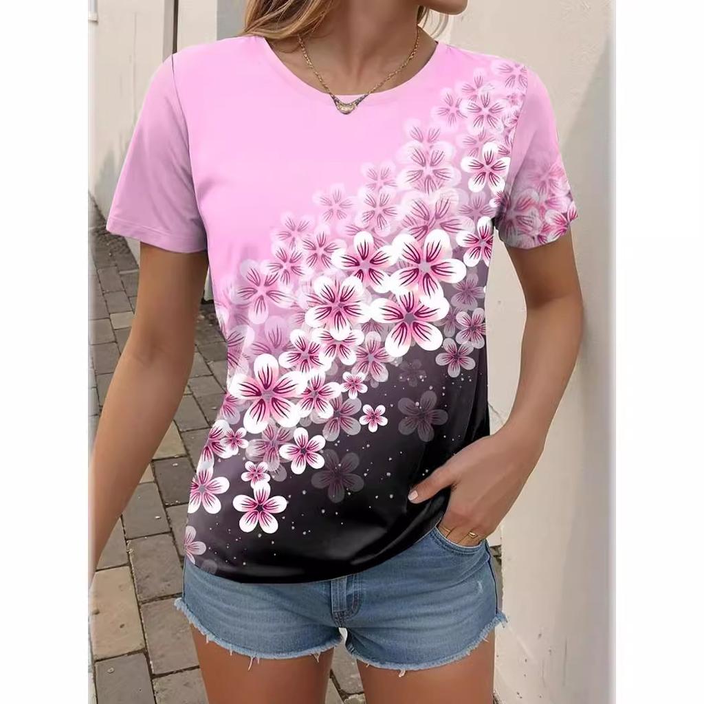 Summer Round Neck 3D Floral & Butterfly Print Top Fashionable Casual Short Sleeved Women's T-shirts