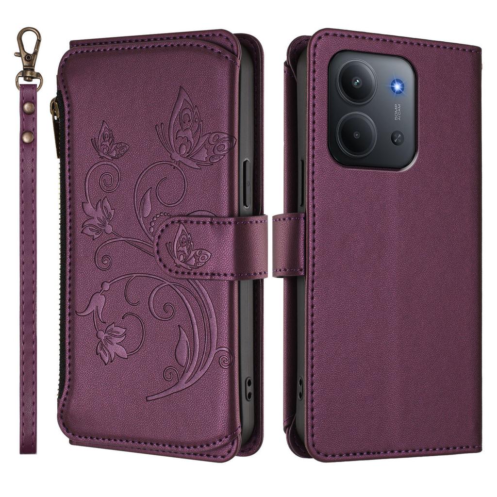 For Xiaomi Redmi 15C 5G (EU) (173mm)/Xiaomi Redmi 15C 4G (EU) (173mm) Leather Case Butterfly Floral Imprint Zipper Wallet Stand Cover with Wrist Strap