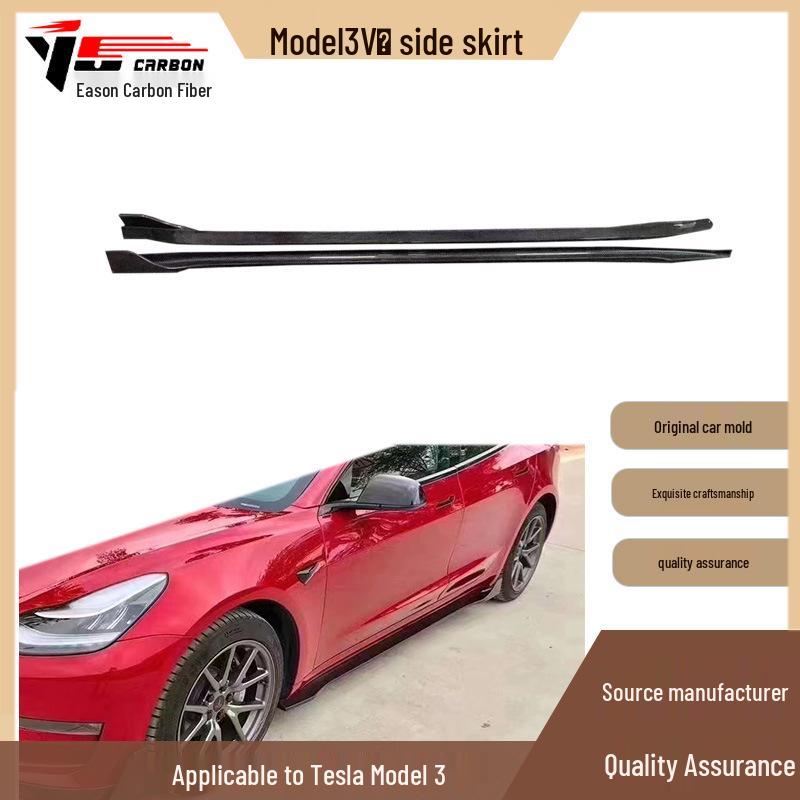 Fits Tesla Model 3, 2018+: V-style Carbon Fiber Side Skirts, Rocker Panels, and Foot Pedals.