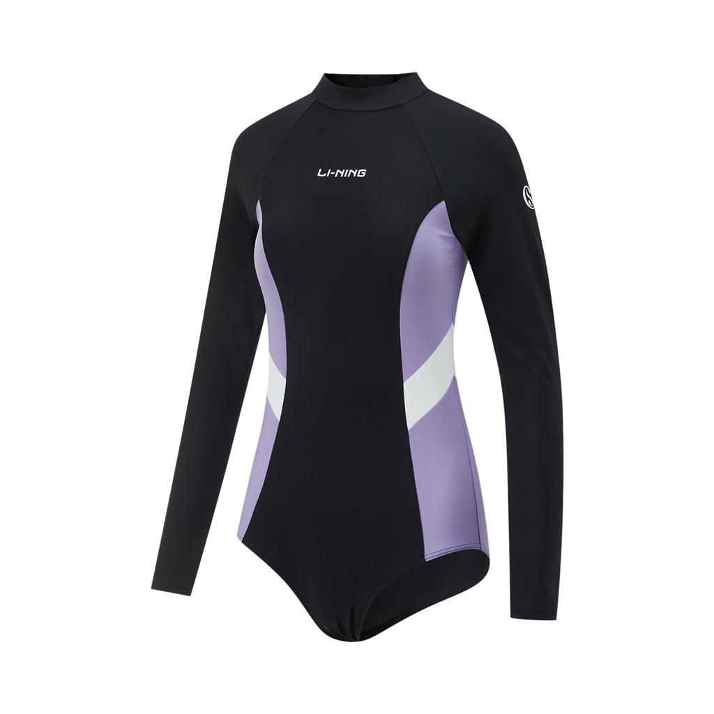 Li-Ning Swimming Series Color Block Letter UV Resistant Breathable Long Sleeve One-Piece Swimsuit Women Swimsuit Black Lilac ASLU110-1