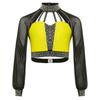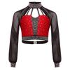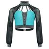 Girls Dance Performance Top Color Block Design Mock Neck Sheer Mesh Sleeves Back Cutout Rhinestone Crop