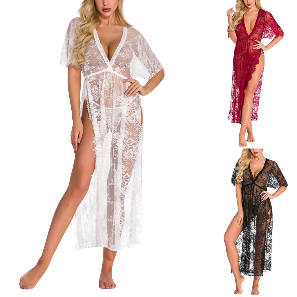 Sexy Lingerie Lace Deep V One-piece Dress For Women With Side-opening Lace One-piece Robe