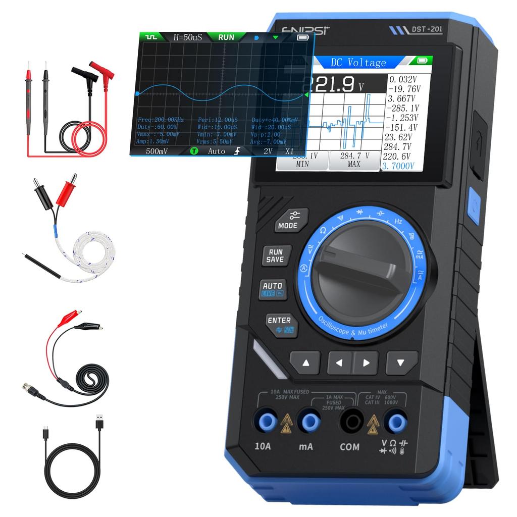 Versatile and Efficient: The DST-201 is a multi-function all-in-one tester that combines a multimeter, oscilloscope, and signal generator. The rotary knob allows for intuitive and smooth switching between measurement items, making it easy to use for beginners and professionals alike. The 2.8-inch TFT color LCD screen clearly displays measurement results, ensuring excellent visibility both indoors and outdoors.
