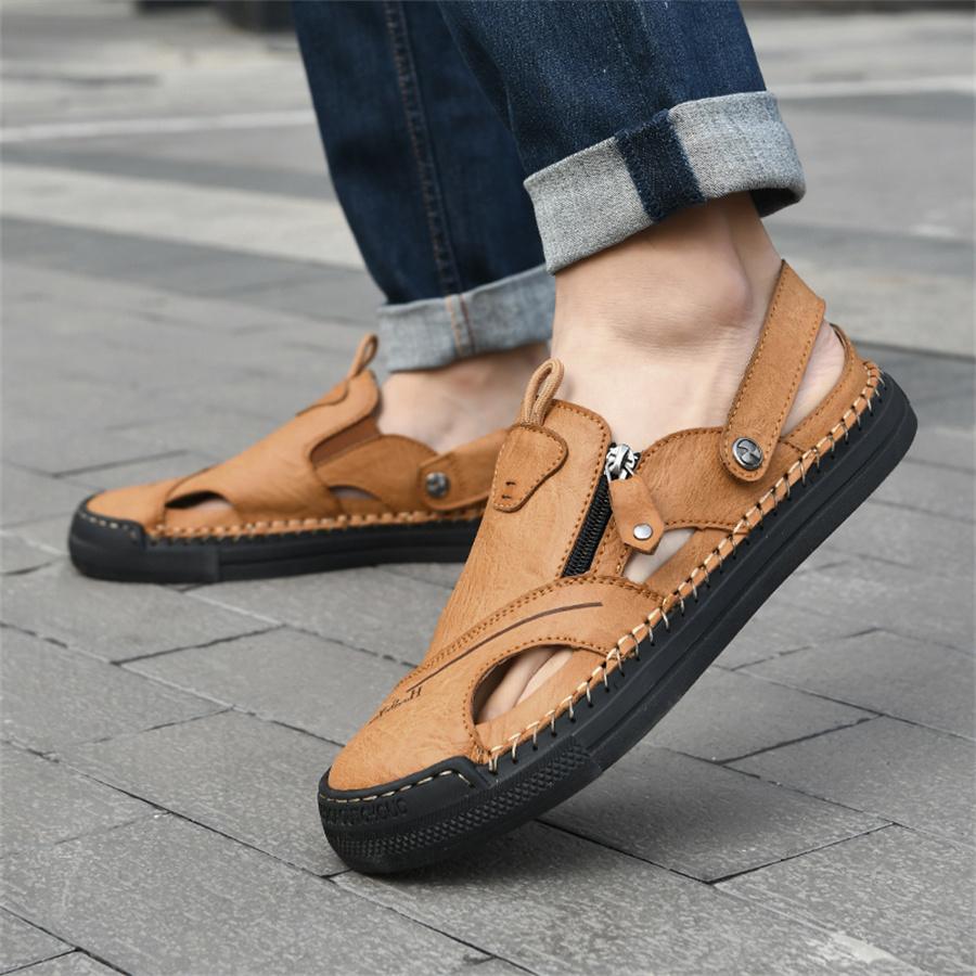 Fashion Outdoor Walking Sandals for Men Non-Slip Loafers Leather Mens Sandals Hollow Out Man Beach Flats Anti-collision Toe Summer Shoes