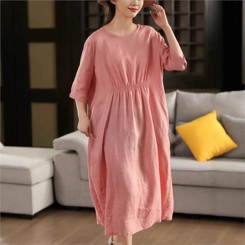Johnature Women Vintage Solid Color Dress O-Neck Half Sleeve Summer Loose Female Fold High Waist Dress