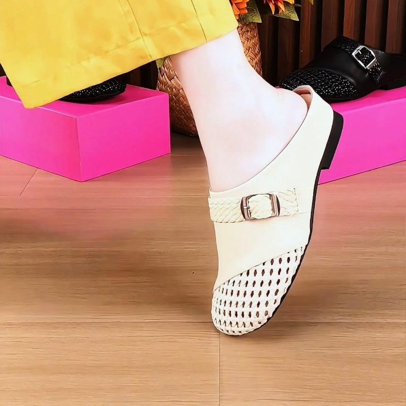 Woven Hollow Bag Head Mop Leather Thick Heel Half Slippers Women's Versatile Low Heel Sandals Women's One-button Round Head Cool Slippers
