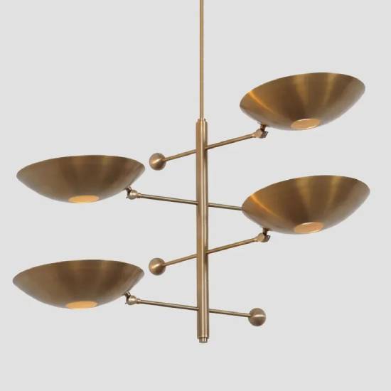Stilnovo-Style 4-Arm Curved Disk Shade Sputnik Ceiling Pendant – Handmade Raw Brass Chandelier Fixture