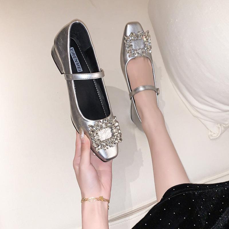 Mary Jane Shoes Women's Spring New Rhinestone Square Buckle Fashion Single Shoes Square Head Thick Heel High Heels Women