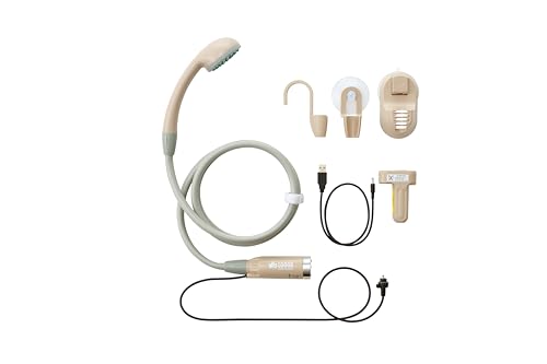 Use it even without running water! This battery-powered portable shower features a compact pump that fits inside a plastic container.