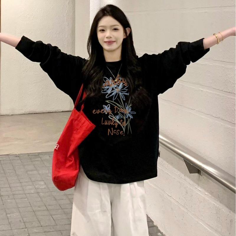 Spring Autumn Loose Casual Vintage Printing Cotton T-shirt Women Long Sleeve Simple All-match Bottomed Tee Top