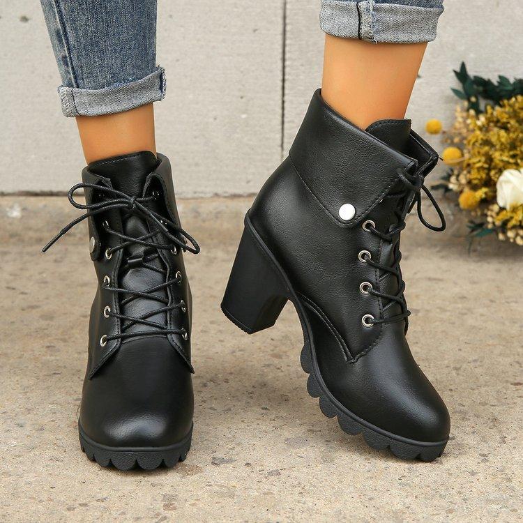 Fashion New Spring Autum Women Pumps Boots Brown Black Lace-up Casual Ladies Shoes PU High Heels Short Botas Roman Style Botines Mujer