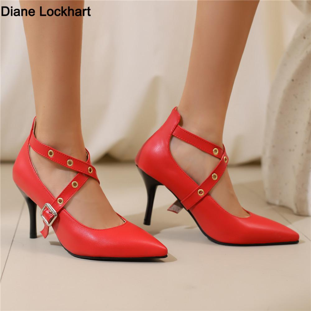 Fashion Pumps High Heel Women New Cross Straps Buckle Wedding Shoes Shallow Pointed Single Shoes Model Nightclub Sexy Plus Size 34-48