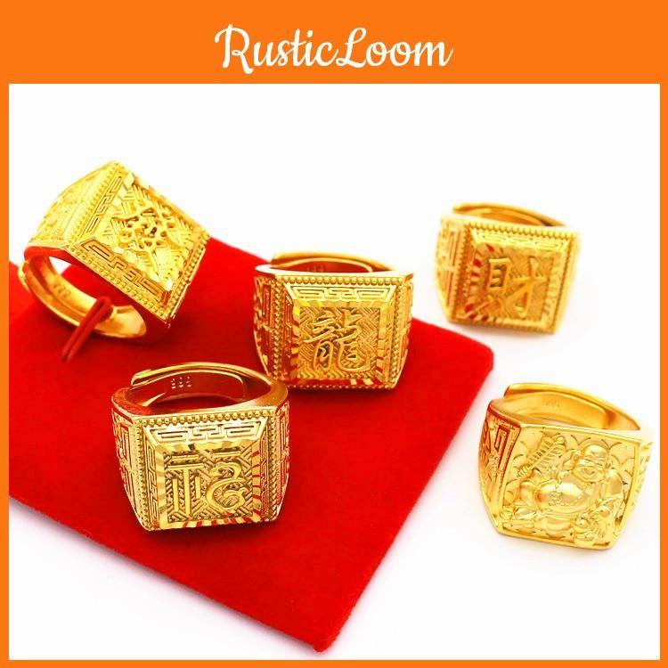 The ring features a square shape, enhanced with intricate engravings of auspicious symbols such as '' (Fortune), '' (Wealth), and '' (Prosperity). Each element has been thoughtfully integrated into the design, making it a meaningful addition to your collection. The golden finish gleams with every movement, drawing attention to the wearer and adding a touch of sophistication to any outfit. Whether you're dressing for a business meeting or a casual outing, this ring complements various styles, embodying a blend of contemporary fashion and traditional symbolism.
