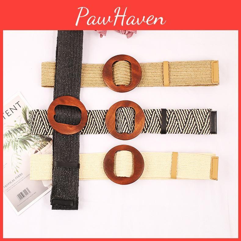 This eco-friendly PP grass woven waist belt features a durable plastic construction with a wooden round buckle, supporting casual and vintage outfits. It offers a comfortable fit for various waist sizes. Ideal for everyday wear, it complements relaxed styles and adds natural charm. Easy to maintain, wipe clean with a damp cloth.