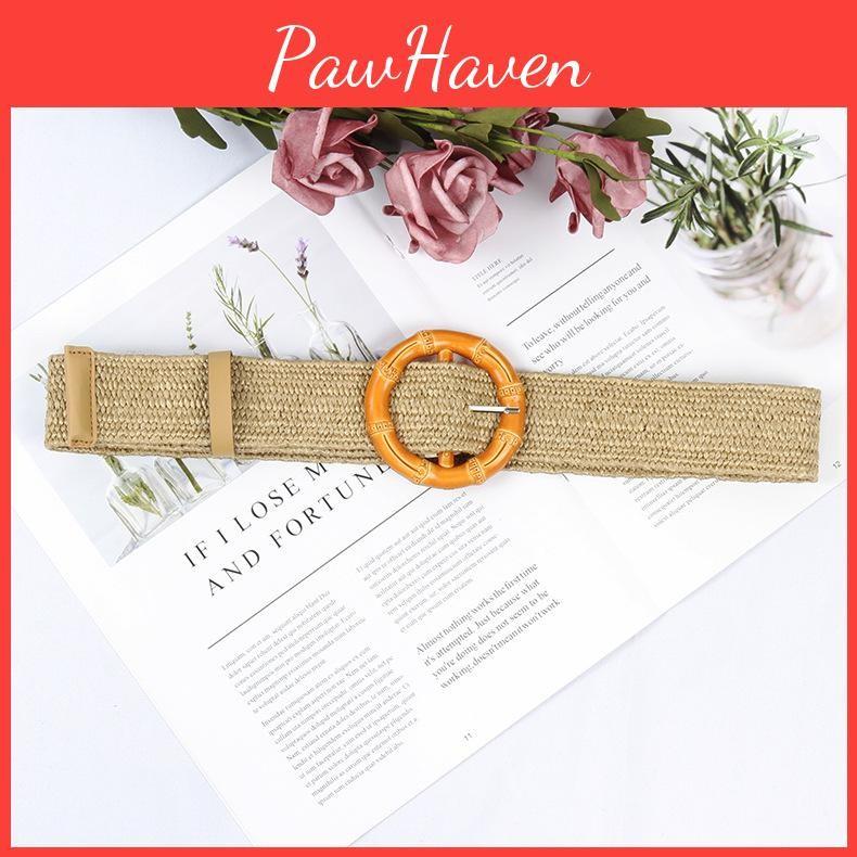 This woven style women's belt features a round buckle made of durable plastic. Crafted with a braided design, it adds texture and visual interest to various outfits. The belt is suitable for beachwear, casual dresses, and summer outings, providing a stylish accent. It comes in multiple colors, including white, black, khaki, and multicolor,Easy to care for, wipe clean with a damp cloth to maintain its woven appearance.