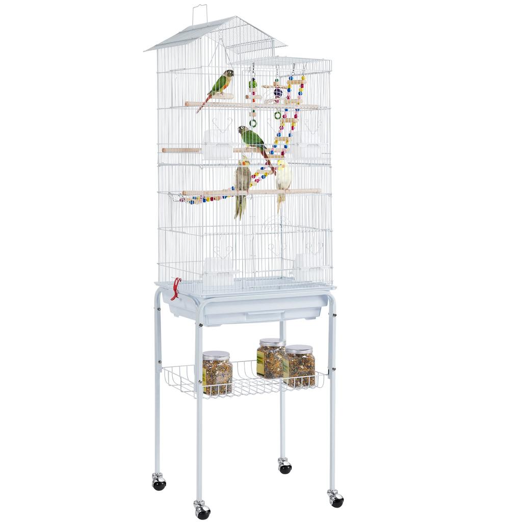 This large bird cage with stand provides a spacious home for your bird and is the perfect choice for bird entertainment! Made from painted metal wire, this parrot cage boasts excellent water resistance and rust resistance. Measuring 46cm wide x 35.5cm long x 99cm high, it can easily accommodate multiple small birds. The fence has a mere 1cm gap, making it ideal for small and medium-sized birds, allowing them to play comfortably. It also comes with four feeders, three perches, two toys, a ladder, and a swing, making it a sweet home for your beloved birds. The smoothly rotating stand also makes this cage easy to transport. It's ideal for small birds such as zebra finches, canaries, parrotlets, Javanese finches, lovebirds, budgerigars, black-headed caiques, shrikes, green-legged parakeets, sun conures, and sun parakeets.