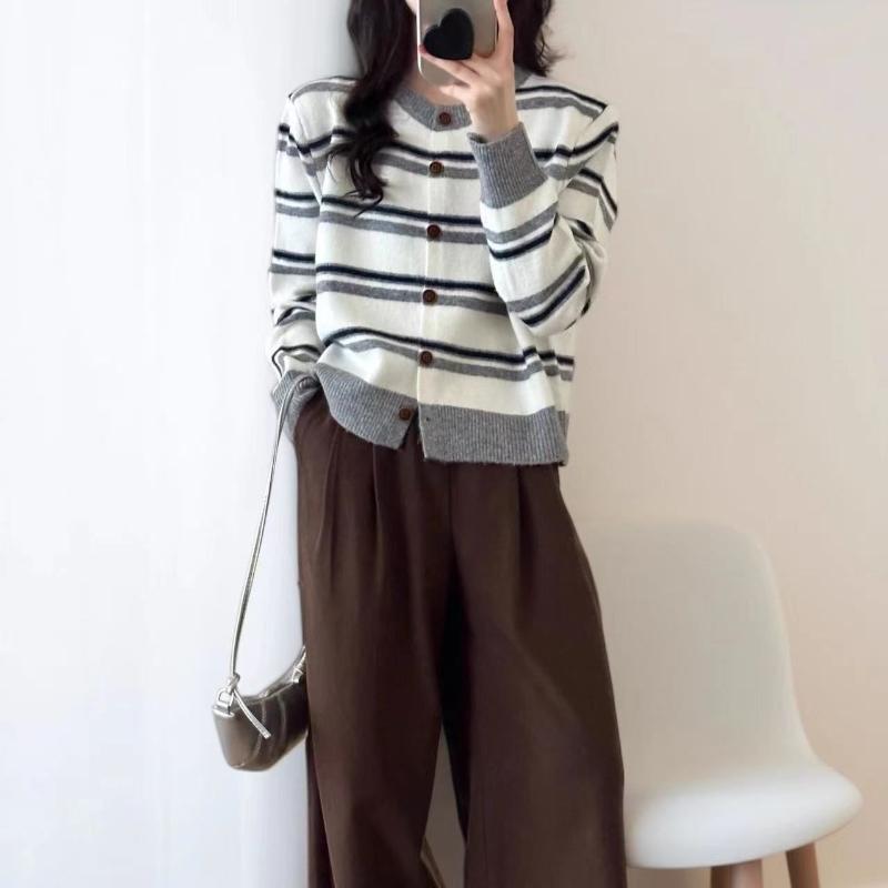 The New Autumn and Winter Color-blocking Striped Loose and Laid-back Coat and Knitted Cardigan Top Are Versatile and Slimming for Women