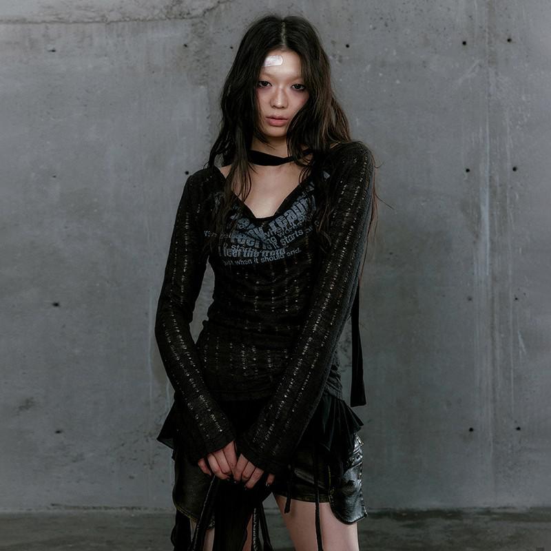2KWEIRD Grunge Aesthetics Knitted Tops Trashy Y2k Graffiti Print T-shirt Vintage Punk Irregular Patchwork Knitwear High Street