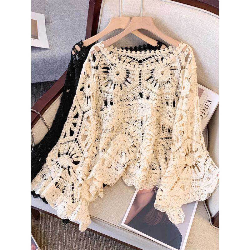 Plus Size European Spring/Summer French Crochet Cut Out Knitwear Loose Long Sleeves Outerwear Cover-up Sun Protection Shirt Female M-4XL