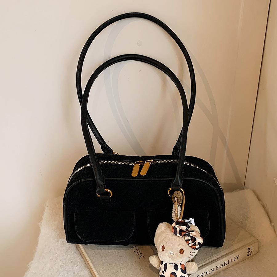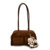 - **Structured Shoulder Bag Details**: Features a sleek structured silhouette with suede-textured PU finish, a cute plush charm (optional), front pocket design, and a classic shoulder strap, exuding vintage and playful charm. Multiple color and charm options cater to diverse style preferences.