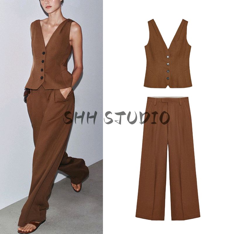 Single Breasted Minimalist All-Match V Neck Sleeveless Vest 3503586 Linen Blend Casual Pleated Pants 2734586