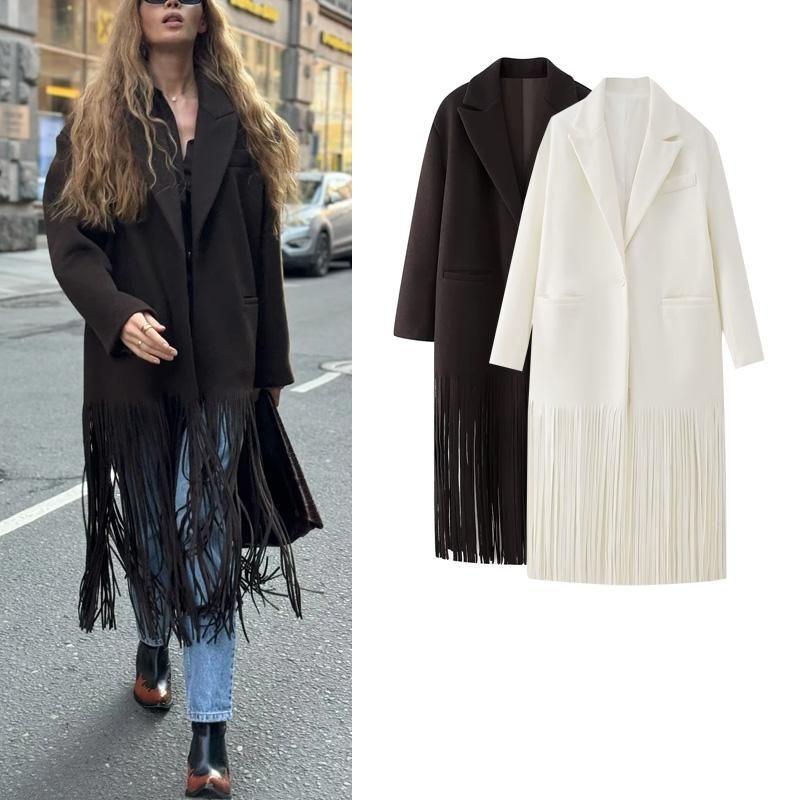 Fall and Winter New Women's Clothing Fashion Wind Lapel Long Sleeves Loose One Button Tassel Mid Length Long Length Woolen Outwear