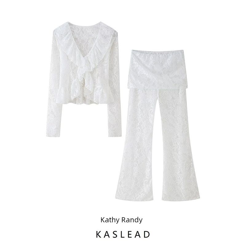 Kaslead New Arrival Women's Clothing Fashion Style Lace Cardigan Long Sleeves Tops Casual Pants Suit