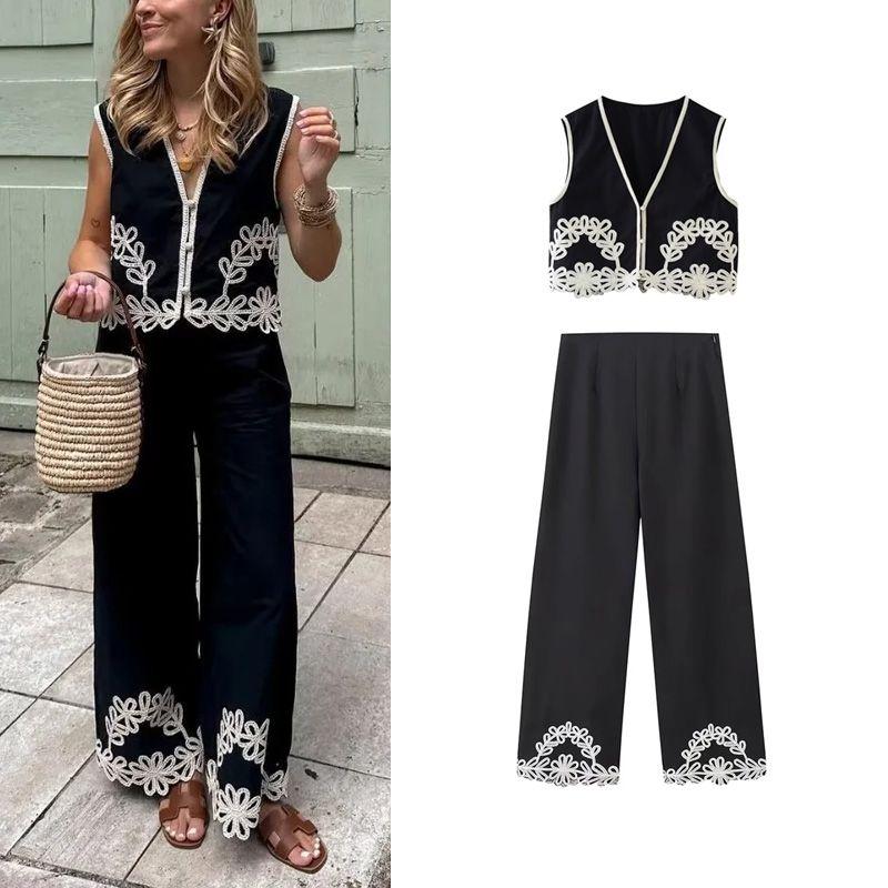 Spring New Design Sense Retro Short V-neck Embroidered Vest High Waist Wide Leg Casual Embroidered Trousers