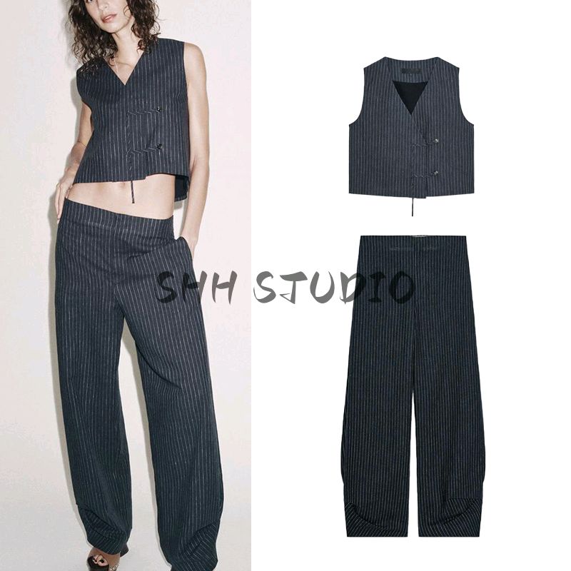 Linen Blended Stripes V Neck Sleeveless Vest Waistcoat 3620530 Balloon Casual Pants 3564530