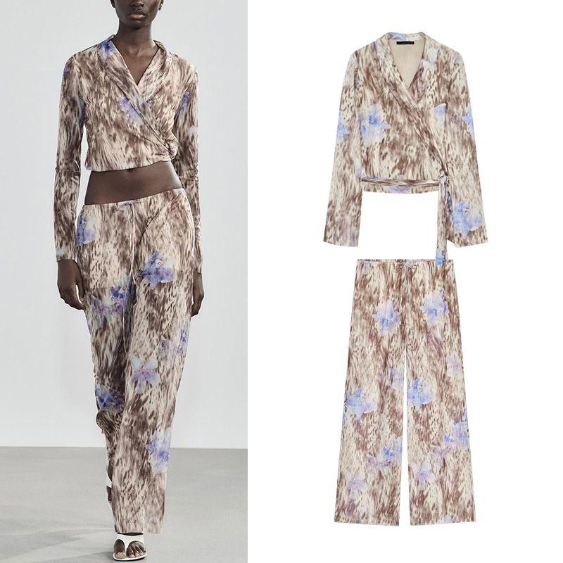 Print Silk Net Long Sleeves Double Breasted V Neck Tops 5039137 Silk Net Translucent High Waist Pants 5039138