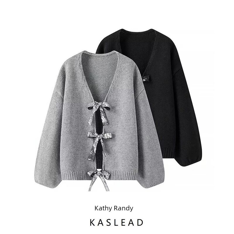 Kaslead New Arrival Women's Clothing Fashion Style Stylish Simple and Versatile Sequin Bowknot Decoration Loose Knitting Sweater