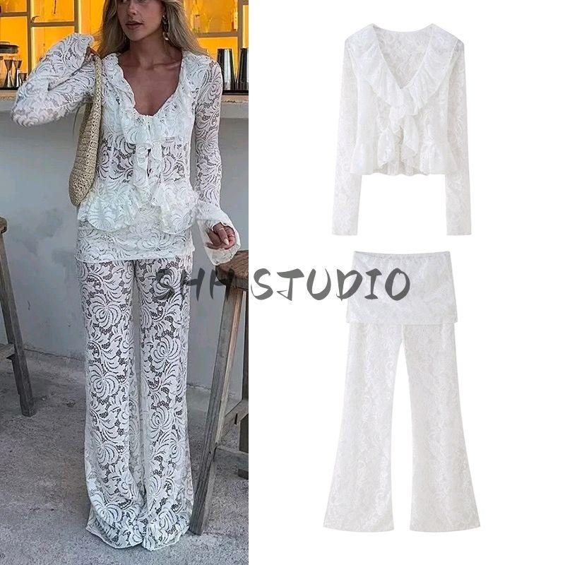 Spring New Women's Clothing Ins Style Lace High Waist Casual Trousers + V Neck Long Sleeves Lace Lace Cardigan Top