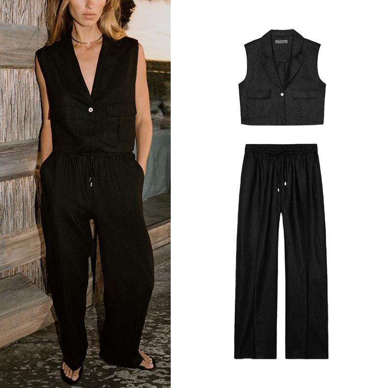 Summer Lapels Vest Style Tops 2373709 Linen Blend Straight-leg High Waist Casual Trousers 9929041