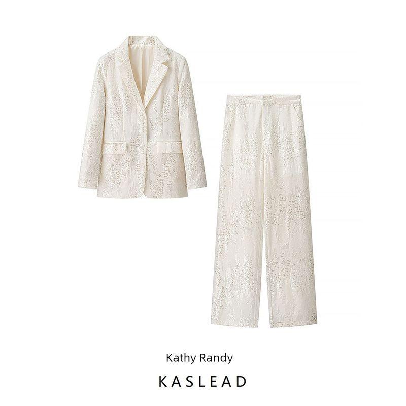 Kaslead New Women Clothes Western Style Fashion Simple Sequin Decoration Blazers Trousers Set