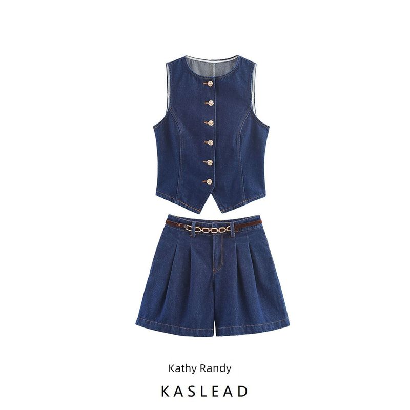 Kaslead New Women Clothes Western Style Gold Button Denim Vest Shorts 6164109 6164112