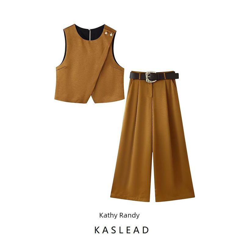 Kaslead New Women Clothes Western Style Double Placket Satin Texture Top Trousers 8459556 7965556