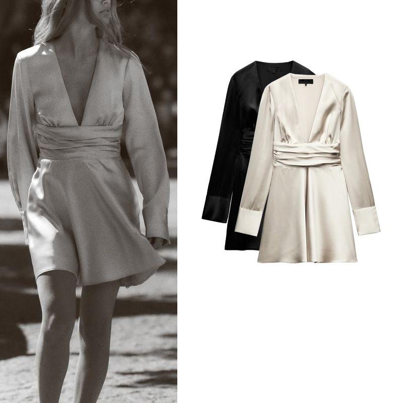 Spring New Women's Clothing French Style Elegant Fashion Silk Satin Texture V Neck Short Version Dress 4764245