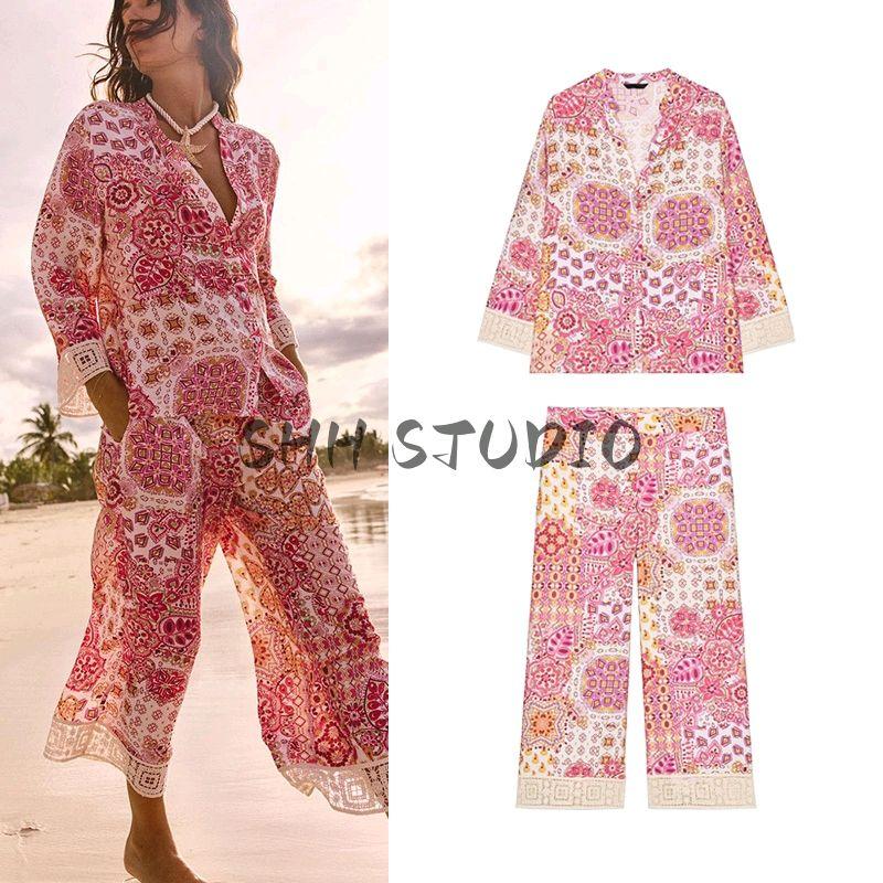 Spring and Summer Embossed Lace Cuffs Print Shirt 3564067 Embossed Lace Pants Feet Printed Pants 3564367
