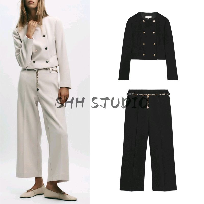 Round Neck Long Sleeve Double Placket Blazers 8372449 High Waist Straight With Chain Belt Ankle Pants 8372249