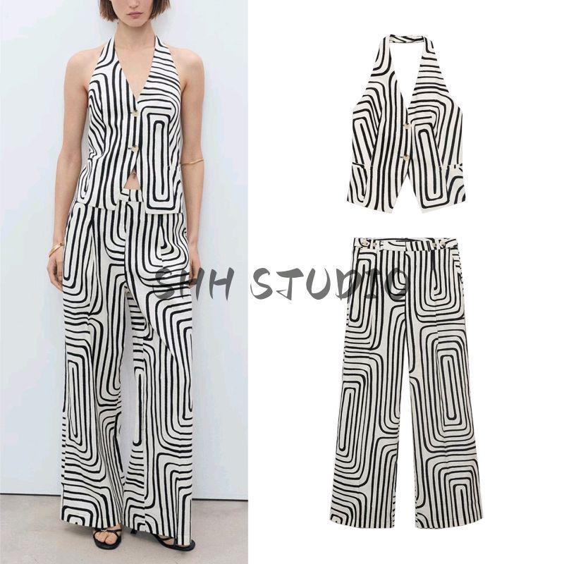 Open Back Hanging Collar Vest 17071150 Cotton and Linen Blended Geometric Pattern Floral Print Casual Jumpsuit 17061155