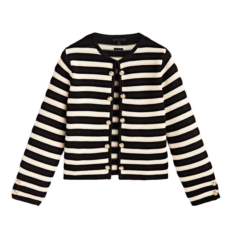MD Spring New Arrival Women Retro Debutante Style Contrast Color Stripes Cardigan Round Neck Long Sleeve Knitted Coat 5637624