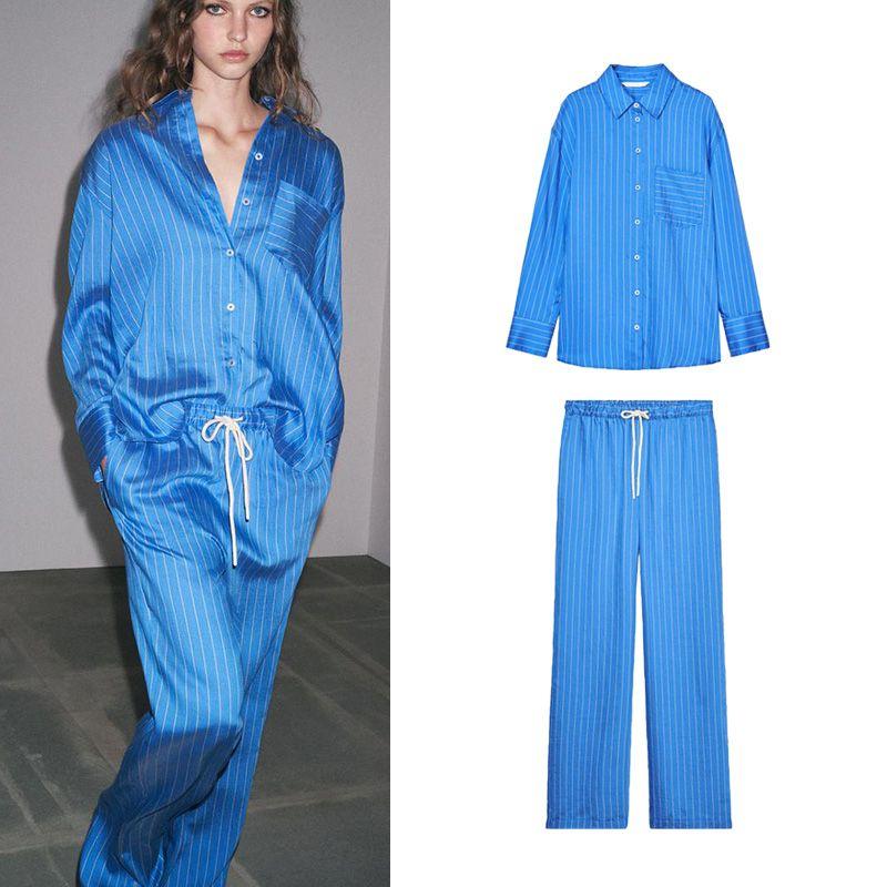 Lyocell Blended Stripes Lapel Long Sleeve Shirt 7563049 Stripes Mid-Waist Straight Pants 7563050