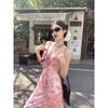Kumikumi Holiday Style Blooming Pink Sling Dress Women Summer Slim Fit Age-Reducing Chic Floral Long Skirt