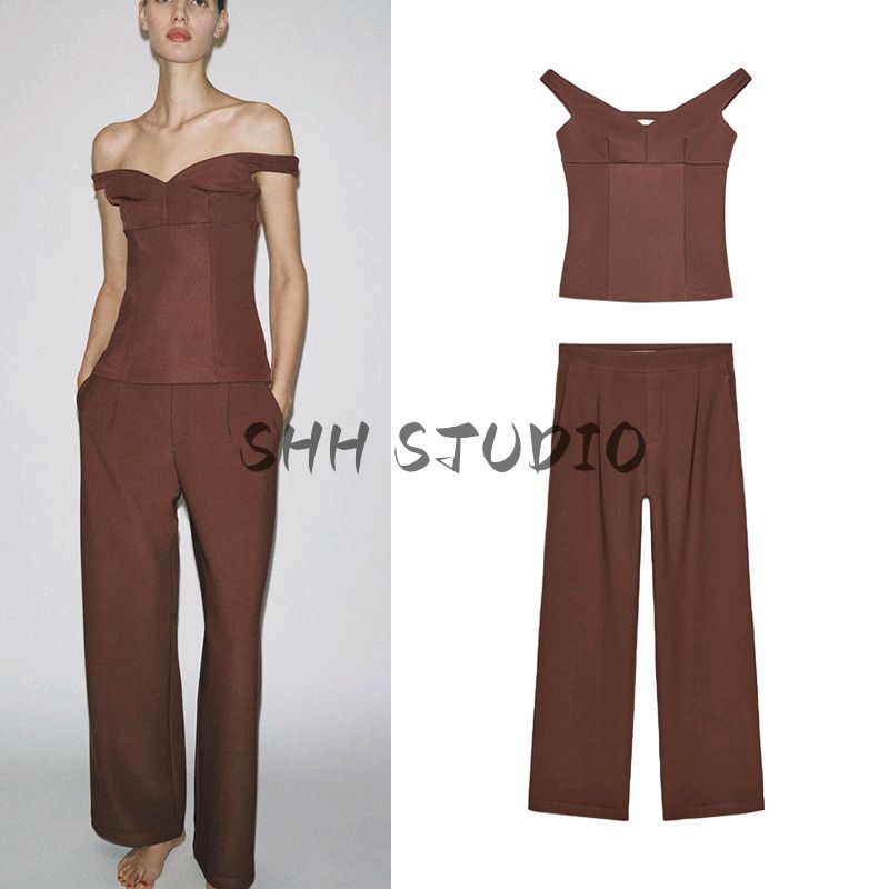 Crepe Wide Leg Mid-Waist Comfortable Minimalist Casual Pants 5070005 V-neck off-Shoulder Short Top 5070004